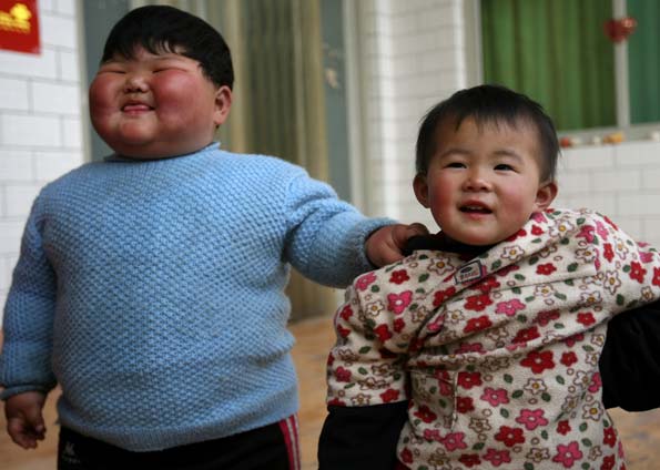 A menina chinesa Pang Ya, de dois anos (a esq.), fica ao lado de uma outra criança nesta segunda-feira (1º) em Yuncheng, na província de Shanxi. Pang Ya nasceu com 4 kg, mas desde então começou a engordar numa velocidade alarmante. Aos 8 meses, ela tinha 20 kg, e hoje tem 41,5 kg.