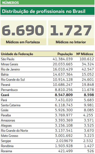 Comparado a outros estados, o Ceará apresenta uma média dentro do estipulado pela OMS, mas abaixo de outros estados da região Nordeste como Pernambuco (um médico para 754 habitantes), Paraíba (um médico para 886 habitantes) e Bahia (um médico para 972 habitantes).