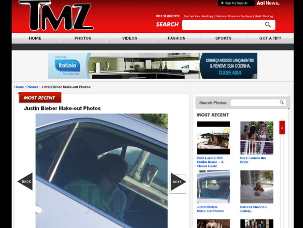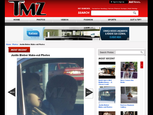 O site “TMZ” divulgou nesta terça-feira, 21, fotos de Justin Bieber no maior amasso com uma garota no banco de trás de um carro. Segundo o site, a garota que aparece com o cantor nas fotos seria Jasmine Villegas, de 16 anos, protagonista do clipe da música “Baby”, do ídolo teen.