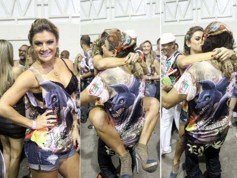 Durante a cerimônia de coroação da nova rainha de bateria da Acadêmicos do Grande Rio, em Duque de Caxias, Rio de Janeiro, que aconteceu na noite deste sábado (16), Mirella Santos recepcionou um amigo com um beijo para lá de caloroso.