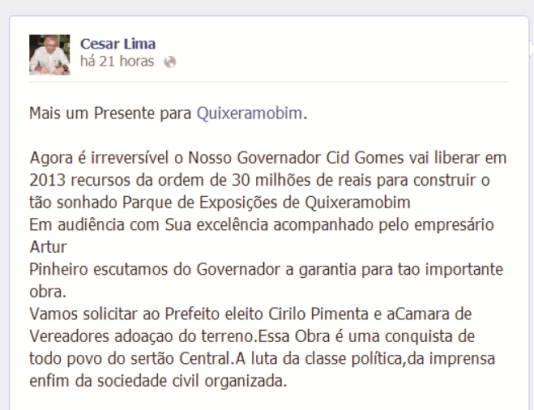 O Superintendente Adjunto do Departamento de Estradas e rodagem, DER, César Barreto, anunciou, via rede social, que o governador Cid Gomes deverá liberar em 2.013 cerca de R$ 30 milhões de reais para construção de um parque de exposições no município.