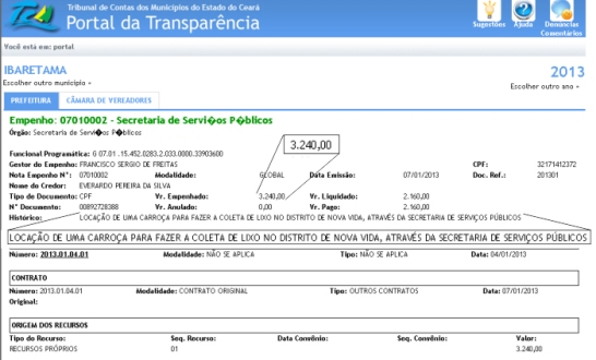 Das denúncias a que mais chamou atenção foi à locação, com recursos próprios, de uma carroça para fazer a coleta de lixo no distrito de Nova Vida, através da Secretaria de Serviços Públicos, tendo R$ 3.240,00 (três mil duzentos e quarenta reais), do valor total empenhado e R$ 2.160,00 (dois mil cento e sessenta), já liquidado.