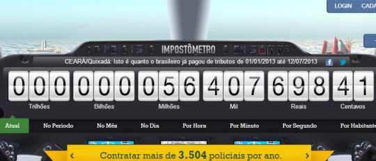 O Impostômetro, medidor eletrônico de arrecadação tributária mantido em São Paulo pela Associação Comercial de São Paulo (ACSP) e pelo Instituto Brasileiro de Planejamento Tributário (IBPT), atingiu nesta sexta-feira, dia 12, a marca de quase R$ 57 milhões de reais em impostos federais, estaduais e municipais pagos pelos quixadaenses desde o começo do ano.