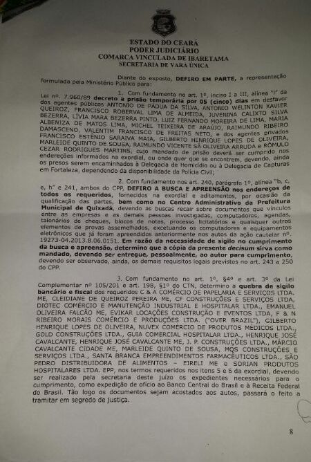 A justiça mandou, também, realizar busca e apreensão no centro administrativo da prefeitura de Quixadá. Veja Abaixo o mandato de prisão: