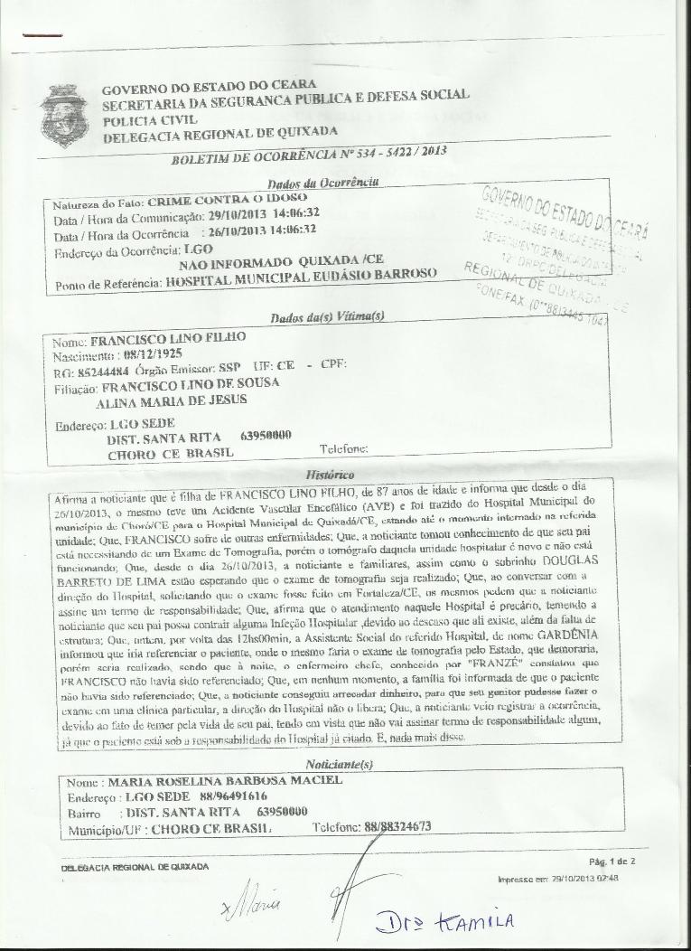De acordo com o boletim de ocorrência, que pode ser visualizado abaixo, o ancião, de 87 anos, estaria desde o último dia 26/10 sofrendo de um acidente vascular encefálico, e havia sido encaminhado do município de Choró, distante aproximadamente 25 quilômetros de Quixadá, para o Hospital Eudásio Barroso, e o mesmo estaria precisando de uma tomografia , porém, apesar de contar com um tomógrafo novo naquela unidade hospitalar, o mesmo não estaria em funcionamento.