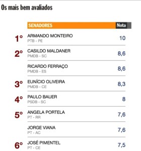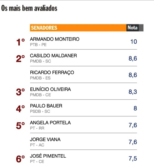 O senador Eunício Oliveira (PMDB), pelo segundo ano consecutivo tem seu nome confirmado pela revista Veja como um dos três melhores parlamentares do Brasil. Em 2013, Eunício aparece em terceiro lugar na publicação semanal e sua nota foi de 8,3. Na avaliação de 2012 o peemedebista se consagrou em primeiro lugar.