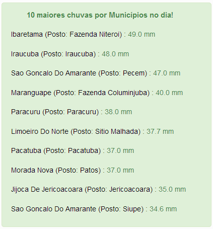 Ibaretama foi o município onde mais choveu em todo o Estado do Ceará nesta última quarta-feira. Nesta quarta-feira, 12, choveu granizo nas localidades de Livramento, em Quixeramobim, e Cipó dos Anjos, em Quixadá. Foi a informação de moradores dos dois locais. O fenômeno surpreendeu os habitantes, que nunca haviam presenciado o ocorrido. Não houve registro de danos.