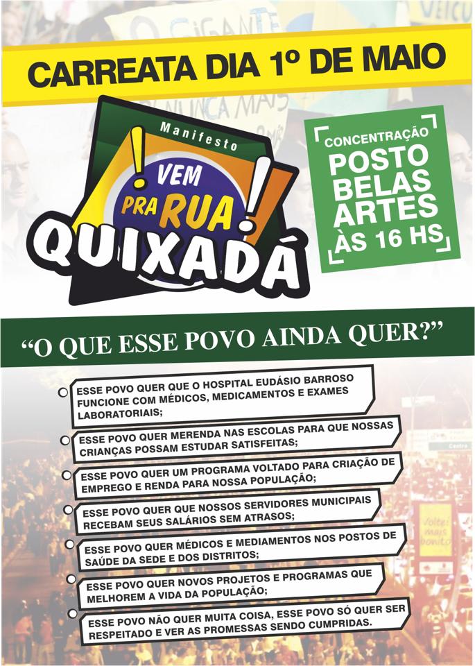 Em Quixadá, a prefeitura realiza tradicionalmente um bingo em praça pública no dia 1º de maio. Em anos anteriores, o horário era sempre estabelecido um pouco mais tarde, geralmente durante a noite. Em 2014, porém, o Poder Executivo dará início ao bingo exatamente no mesmo horário em que o povo pretende participar de uma manifestação de rua, numa clara tentativa de enfraquecê-la.