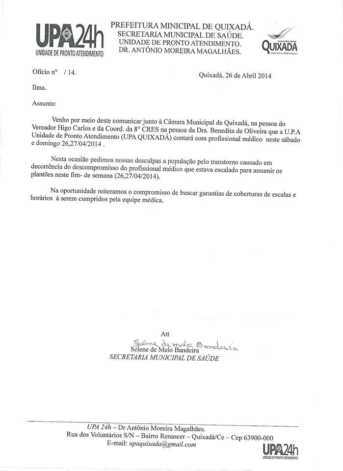 A Secretária de Saúde de Quixadá, Selene Bandeira, assinou um termo de compromisso garantindo que haverá médicos na UPA durante este fim de semana.