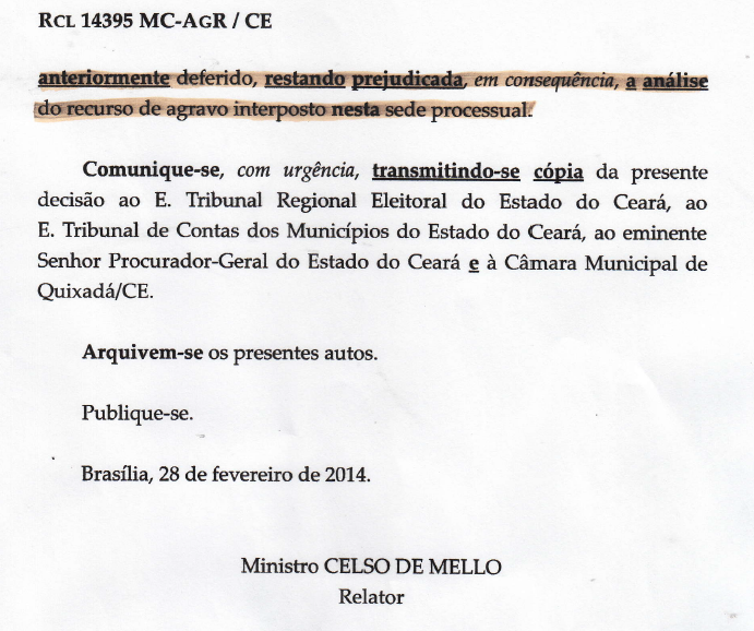 A decisão do Ministro Celso de Mello foi informada à Câmara Municipal de Quixadá no dia 11 de março deste ano, porém, estranhamente o Presidente Pedro Baquit não deu publicidade acerca do assunto. A comunicação do STF nem mesmo foi lida para os parlamentares.