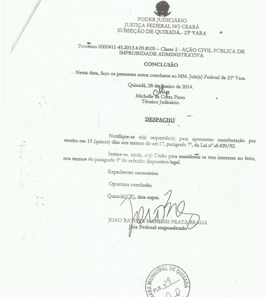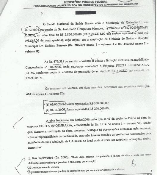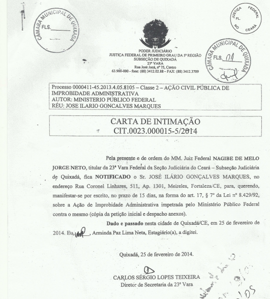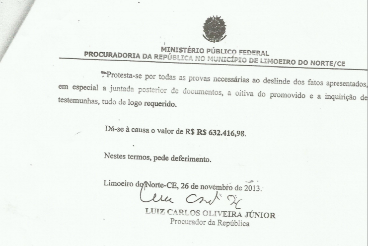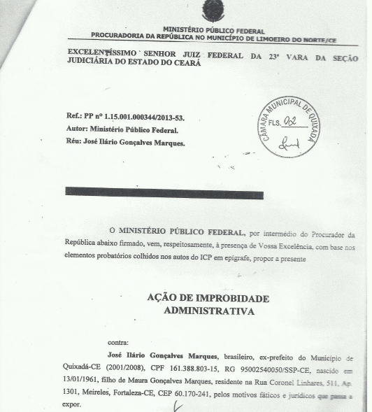 Os editores do Monólitos Post tiveram acesso com exclusividade a um importante documento, assinado pelo Procurador da República, Dr. Luís Carlos Oliveira Júnior, no qual o Ministério Público Federal denuncia à Justiça o ex-prefeito de Quixadá, Ilário Marques, e pede que lhe seja aplicada nota de improbidade administrativa, além de solicitar que o petista devolva aos cofres públicos mais de meio milhão de reais.