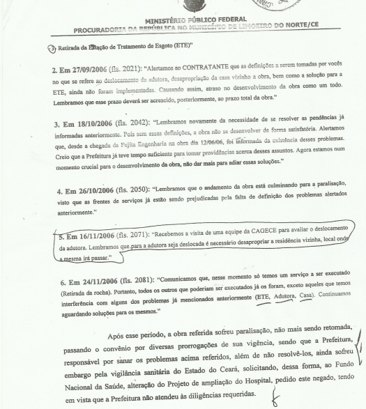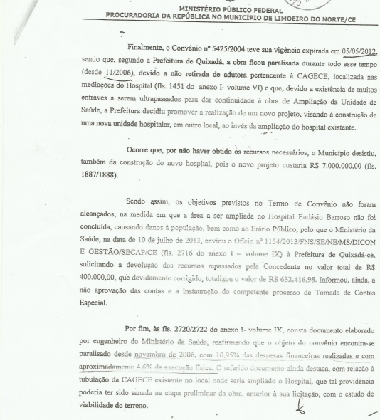 De acordo com o MPF, as verbas repassadas para execução da obra “foram utilizadas inadequadamente pela Prefeitura de Quixadá”. O procurador também aponta o fato de que uma tomada de contas especial desaprovou as contas de Ilário Marques referentes ao período, o que também geraria nota de improbidade.