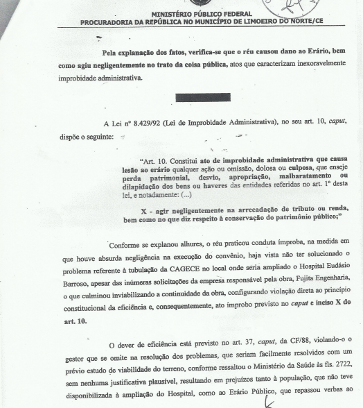 Na peça, o MPF acusa o ex-prefeito de ter causado dano ao erário e de ter sido negligente no trato da coisa pública durante execução de convênio com o Governo Federal para reforma do Hospital Eudásio Barroso, em 2006. “Pela explanação dos fatos, verifica-se que o réu causou dano ao Erário, bem como agiu negligentemente no trato da coisa pública, atos que caracterizam inexoravelmente improbidade administrativa”, defende o órgão ministerial.