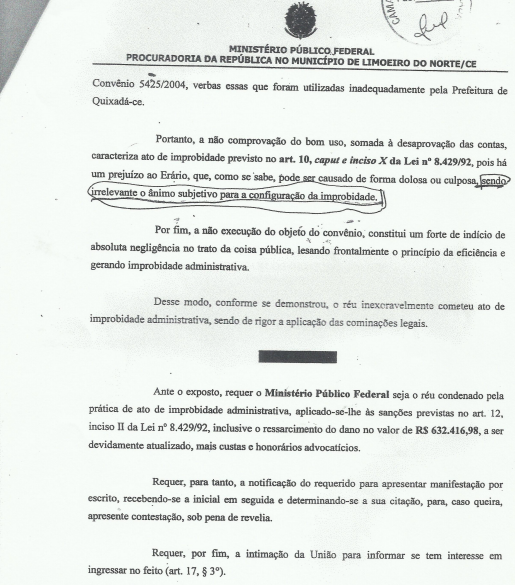 “Ante o exposto, requer o Ministério Público Federal seja o réu condenado pela prática de ato de improbidade administrativa, aplicando-lhe as sanções previstas no Art. 12, inciso II, da Lei 8.429/92, inclusive o ressarcimento do dano no valor de R$ 632.416,98, a ser devidamente atualizado, mais custas e honorários advocatícios”, concluiu o Procurador da República.