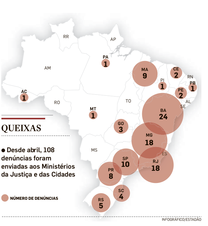 Depois do tráfico, o segundo maior número de relatos envolve a invasão de apartamentos (em grande parte das vezes, os crimes estão correlacionados), presente em 48% das denúncias. A lista foi obtida pelo Estado de S. Paulo no Ministério da Justiça, por meio da Lei de Acesso à Informação.