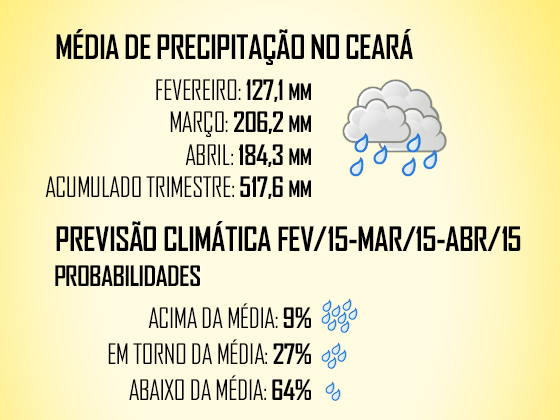 De acordo  com  Eduardo Sávio Martins, da Funceme, o estudo apontou 64% de probabilidade de as chuvas ficarem abaixo da média este ano; 27% para clima normal e apenas 9% para clima chuvoso.