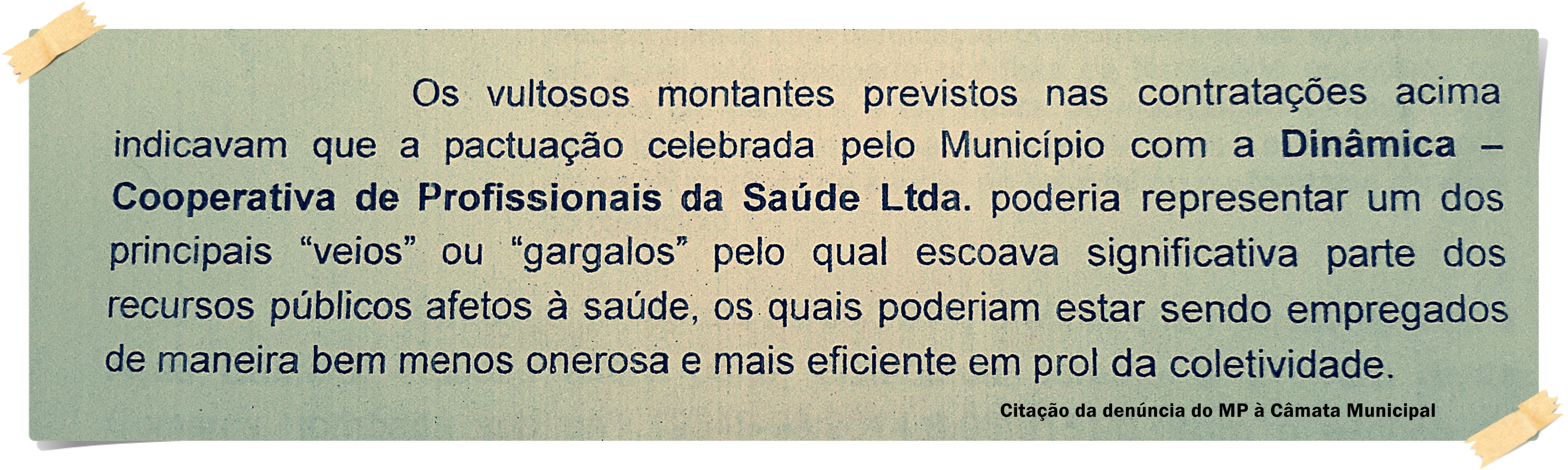 O argumento do Ministério Público baseia-se no fato constatado de que “muitas funções indispensáveis ao serviço de saúde pública, como as de médicos, enfermeiros, técnicos em radiologia, etc, que deveriam ser exercidas por servidores integrantes do próprio quadro de pessoal da Administração, passaram a ser realizadas por profissionais vinculados à Cooperativa e por ela remunerados. Ao município, ficou apenas a incumbência de efetivar pagamentos mensais à Dinamica. Tais pagamentos não foram contabilizados como gastos de pessoal, mas sim como pagamentos a pessoa jurídica fornecedora”.