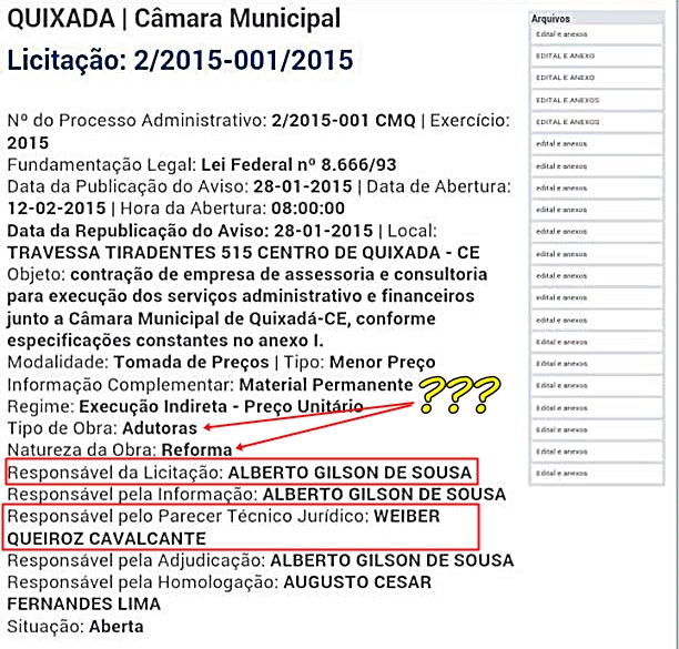 Segundo a denúncia do vereador, nenhum funcionário da Câmara, nem mesmo o próprio presidente da comissão de licitação, Alberto Gilson de Sousa, tinha conhecimento sobre a licitação de nº 2/2015-001/2015, que tem como objetivo a contratação de uma empresa de assessoria e consultoria para execução dos serviços administrativos e financeiros da casa legislativa.