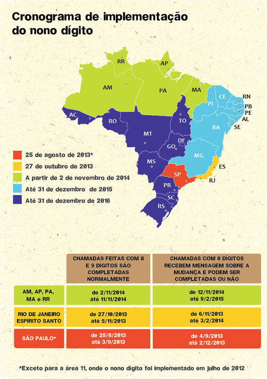A mudança, que já foi feita nos estados de São Paulo, Rio de Janeiro, Espírito Santo, Amapá, Amazonas, Maranhão, Pará e Roraima, atende a resolução nº 553 da Agência Nacional de Telecomunicações (Anatel), de 14 de dezembro de 2010. O nono dígito na telefonia móvel será implementado em todo o Brasil até o fim de 2016.