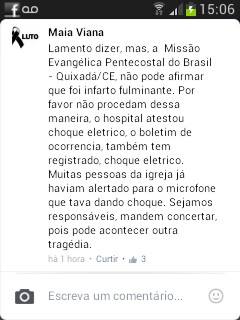 O contador Maia Viana, tio de Gislene, comentou numa rede social: “Lamento dizer, mas a Missão Evangélica Pentecostal do Brasil/CE, não pode afirmar que foi infarto fulminante. Por favor não procedam dessa maneira, o hospital atestou choque elétrico, o boletim de ocorrência também tem registrado choque elétrico. Muitas pessoas da igreja já haviam alertado para o microfone que tava dando choque. Sejamos responsáveis, mandem concertar, pois pode acontecer outra tragédia.”
