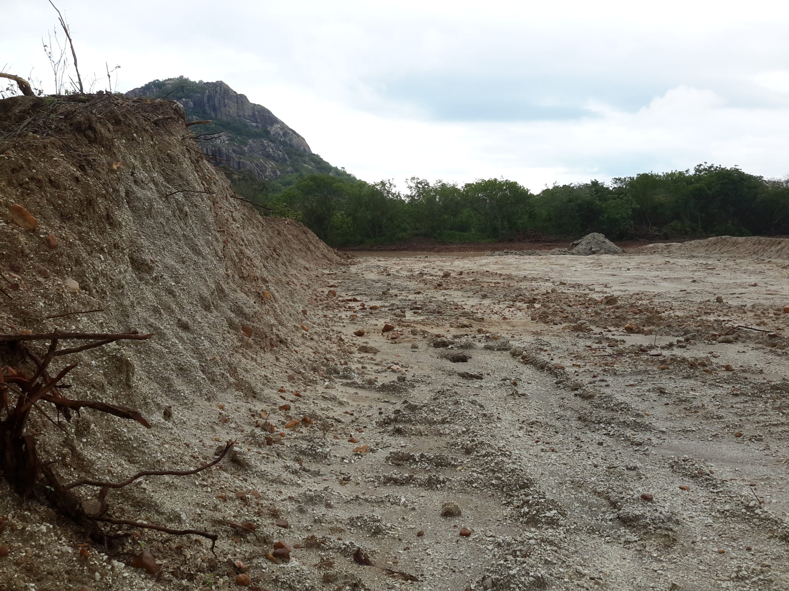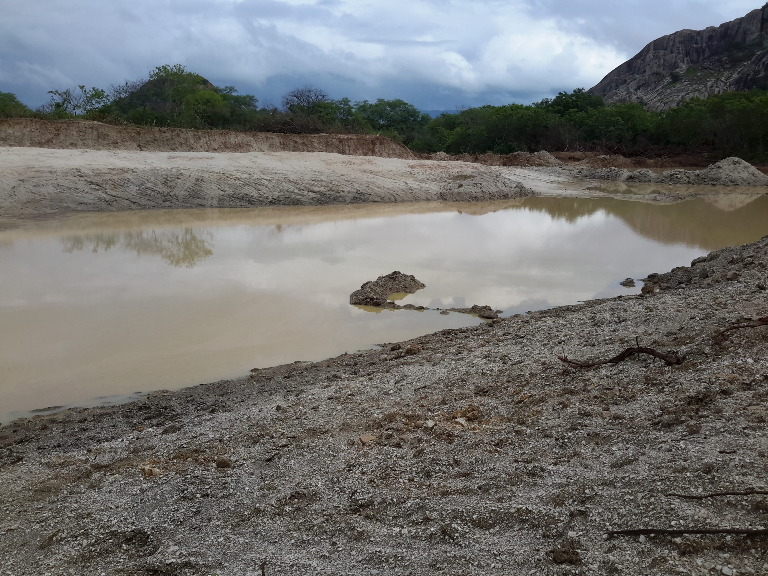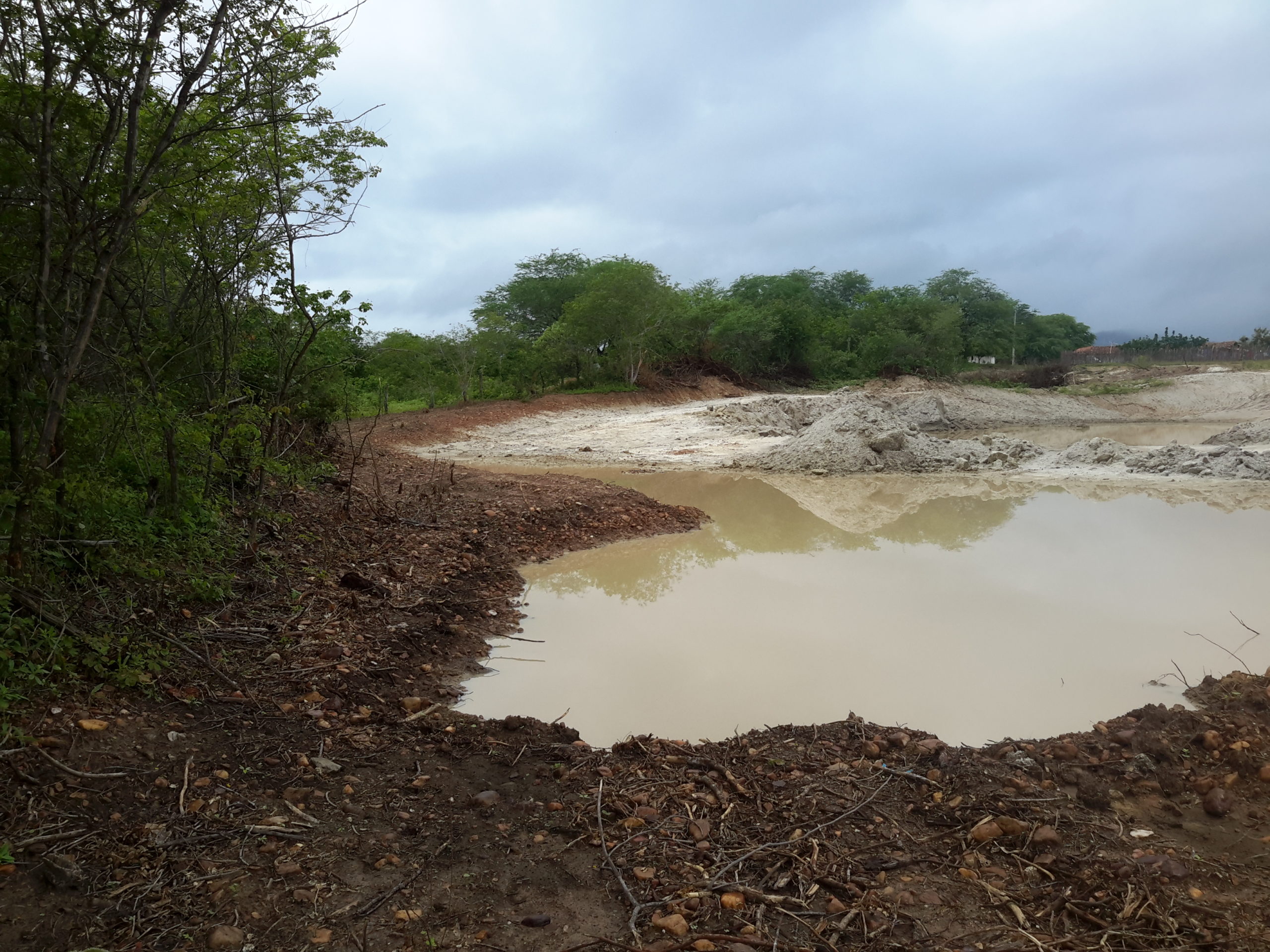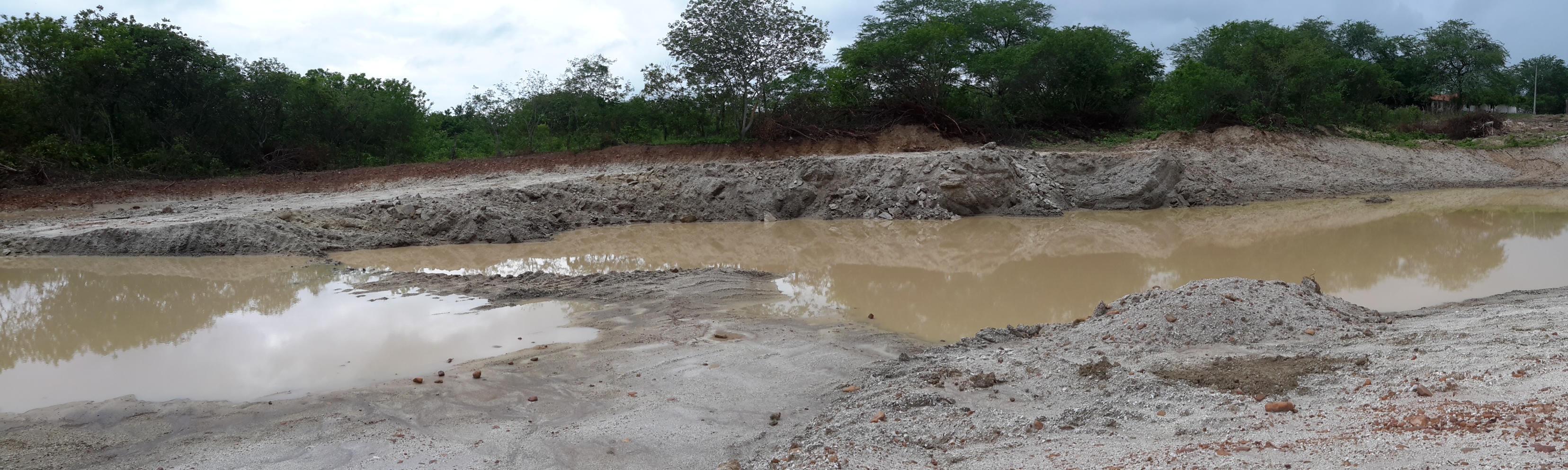 Máquinas levadas para a área continuaram extraindo aterro, deixando, no final, uma enorme cratera de centenas de metros de extensão. Com as chuvas mais recentes, o enorme buraco acumulou significativa quantidade de água. O material considerado bom, abaixo da primeira camada, teria sido destinado às obras da UFC e do DETRAN em Quixadá.