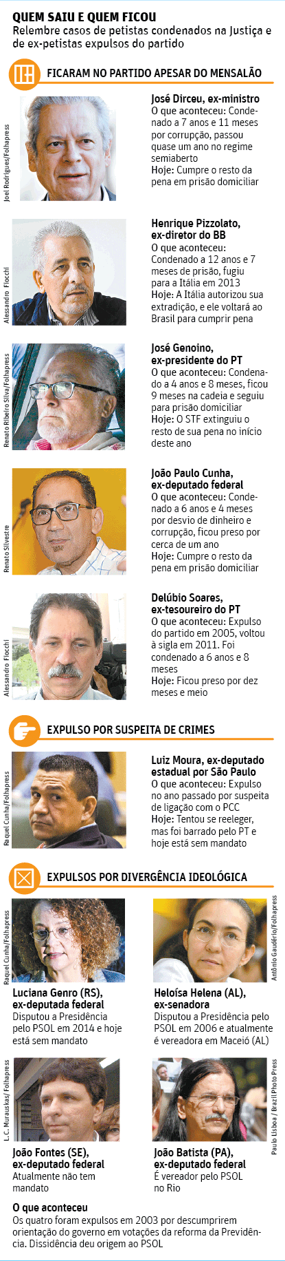 O estatuto do PT, que traz as regras de funcionamento interno do partido, já trata do assunto. “Dar-se-á a expulsão nos casos em que ocorrer condenação por crime infamante ou por práticas administrativas ilícitas, com sentença transitada em julgado”, diz o documento.