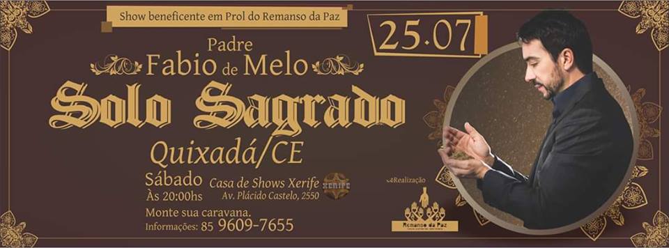 Está confirmada a data programada para o Show beneficente Solo Sagrado, do Padre Fábio de Melo, em Quixadá: será no dia 25 de julho, na Casa de Shows Xerife.