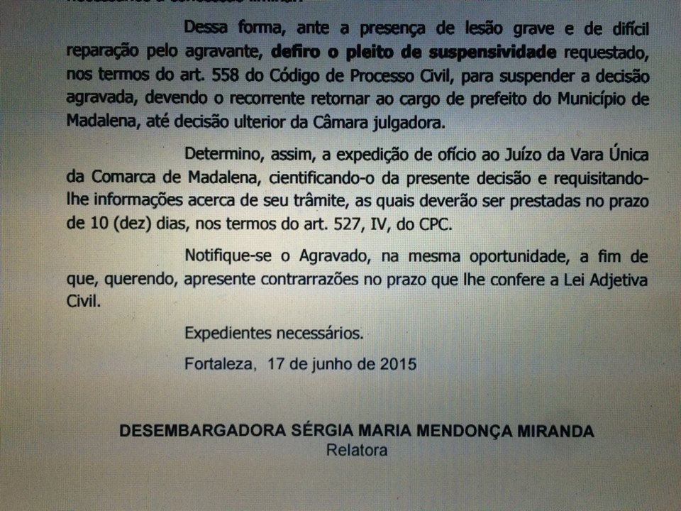 A decisão é da Desembargadora Sergia Maria Mendonça Miranda, que se pronunciou da seguinte forma: “Ante a presença de lesão grave e de difícil reparação pelo agravante, defiro o pleito de suspensividade requestado, nos termos do art 558 do Código de Processo Civil, para suspender a decisão agravada, devendo o recorrente retornar ao cargo de prefeito do Município de Madalena, até decisão ulterior da Câmara julgadora.”