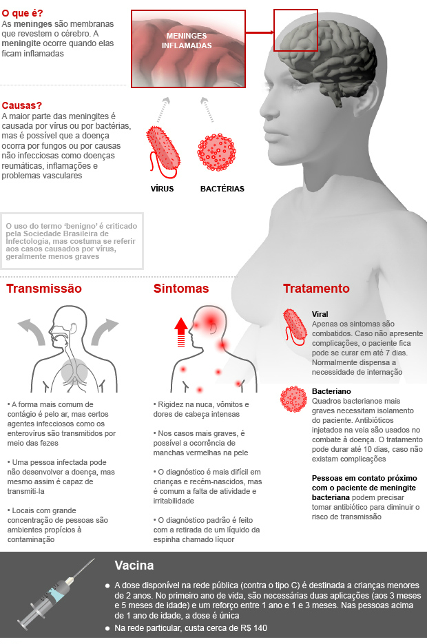 Nos casos de meningite bacteriana, em pouco tempo os sintomas aparecem: febre alta, mal-estar, vômitos, dor forte de cabeça e no pescoço, dificuldade para encostar o queixo no peito e, às vezes, manchas vermelhas espalhadas pelo corpo. Esse é um sinal de que a infecção está se alastrando rapidamente pelo sangue e o risco de septicemia aumenta muito.
