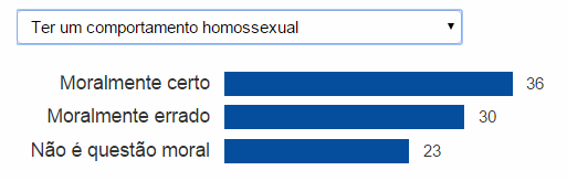 Ter comportamento homossexual era, há oito anos, moralmente inaceitável para quase metade dos brasileiros de 16 a 24 anos. Hoje, 30% ainda veem o comportamento dessa forma, enquanto 36% o acham aceitável.