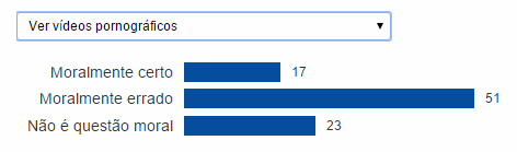 Metade (51%) dos brasileiros de 16 a 24 anos acha moralmente inaceitável ver vídeos pornográficos, enquanto a outra metade se divide entre os que acham aceitável, os que acham que não é uma questão moral e os que acham que depende da situação.