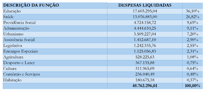 Conforme mostra o quadro a seguir, R$ 48.762.296,01 já foram gastos nas diversas áreas de atuação do governo, como saúde, educação, transporte, e outras. Este montante não inclui as despesas com pessoal, que serão apresentadas mais à frente.