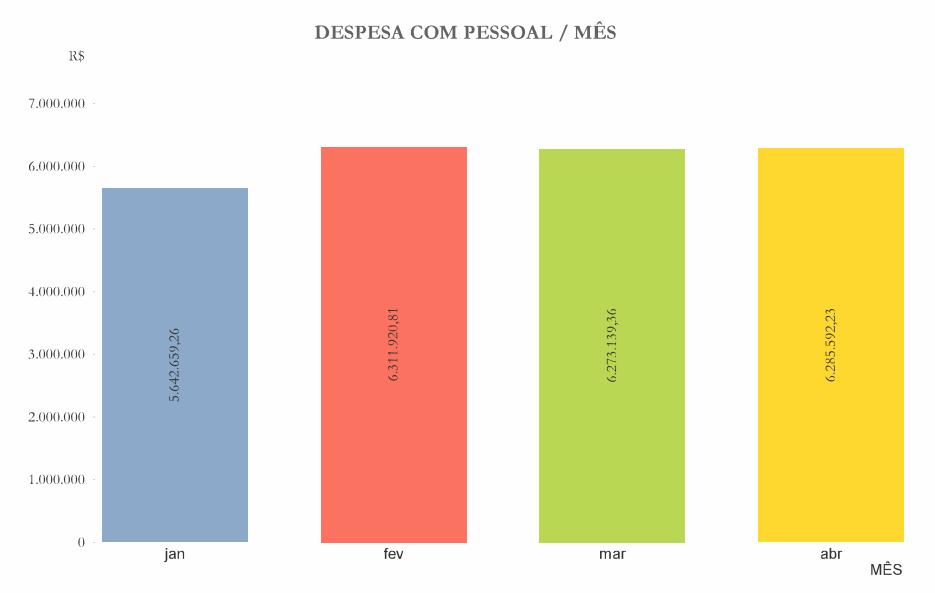 Agora, no gráfico a seguir, veja as despesas mensais com pessoal relativas ao mesmo período. Conforme se pode notar, houve aumento de janeiro para fevereiro, uma redução entre fevereiro e março e um leve aumento no mês de abril. Ou seja: ainda não é perceptível nenhum movimento significativo de redução nos gastos com pessoal neste período em análise. O valor total foi de R$ 24.513.311,66.