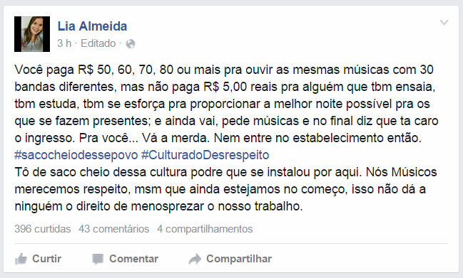 “Nós músicos merecemos respeito, mesmo que ainda estejamos no começo, isso não dá a ninguém o direito de menosprezar o nosso trabalho”, acrescentou ela.