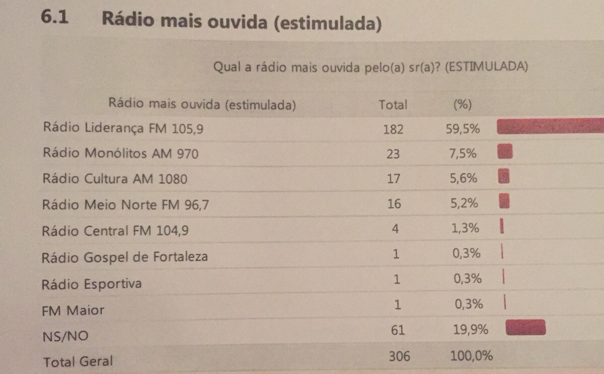 Segundo o resultado de pesquisa a Rádio Liderança vem em primeiro lugar com quase 60% da preferência dos quixadaenses. Já na segunda colocação vem a Rádio Monólitos com quase 8%.