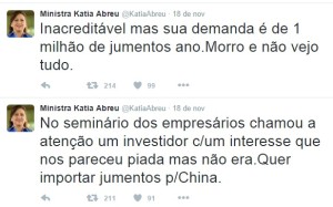 No Twitter ela escreveu: “No seminário dos empresários chamou a atenção um investidor com um interesse que nos pareceu piada, mas não era. Ele quer importar jumentos para a China”.