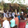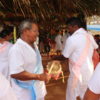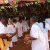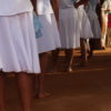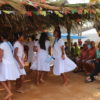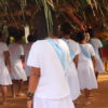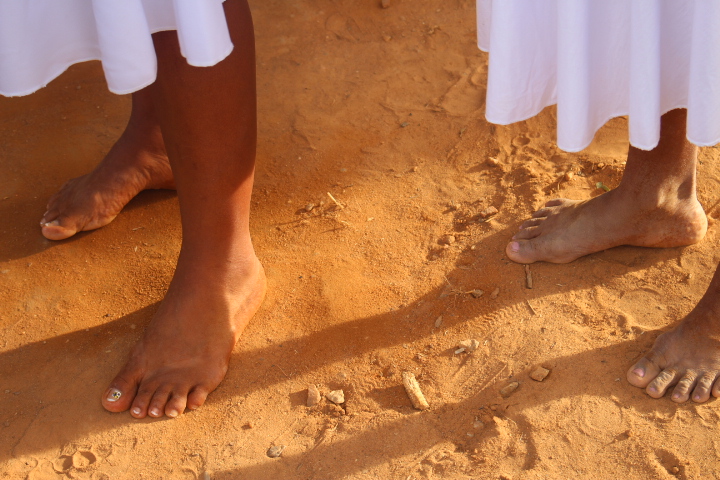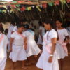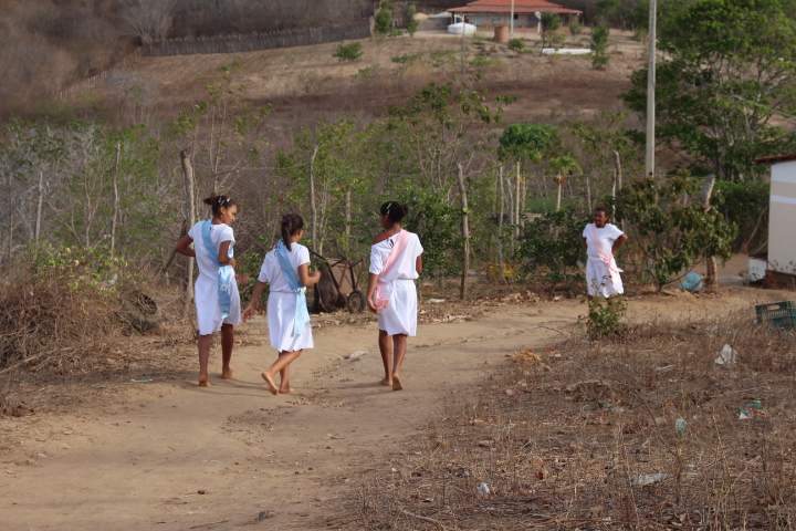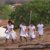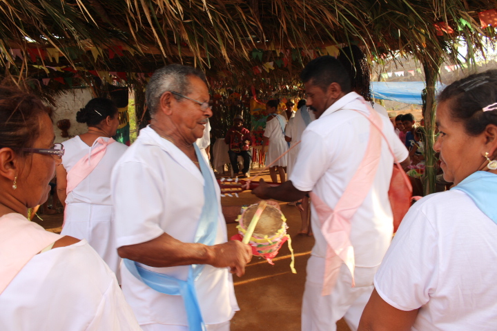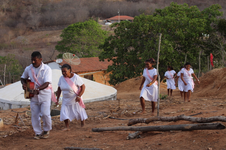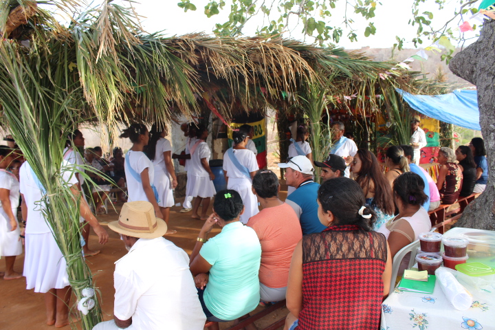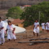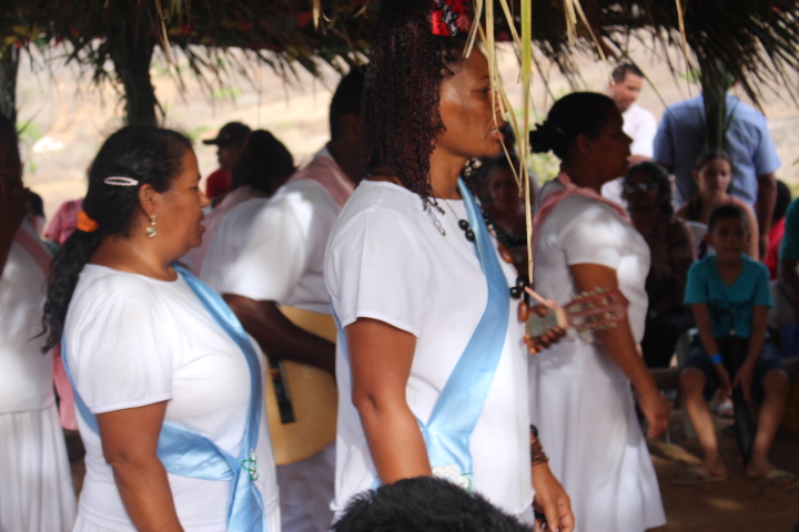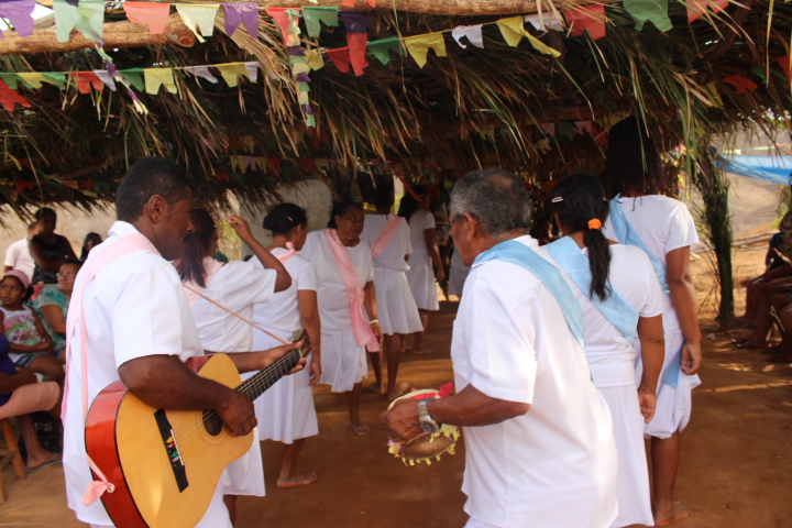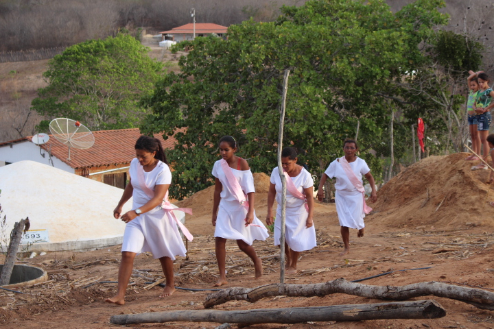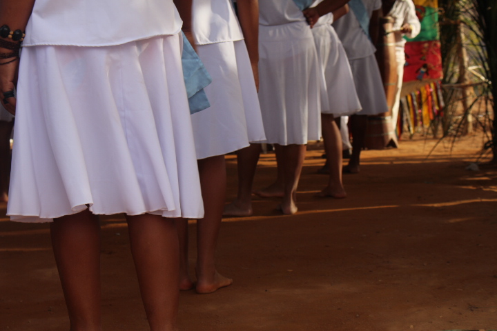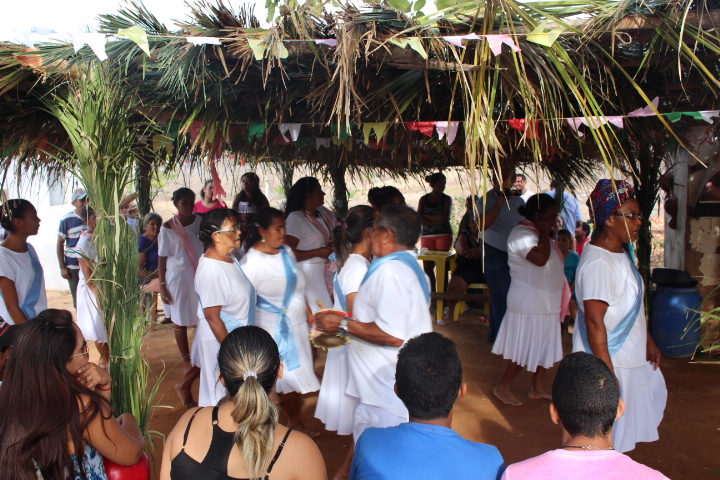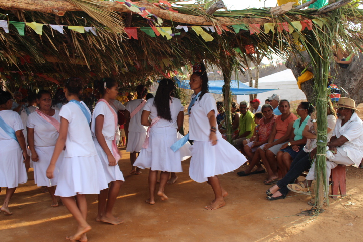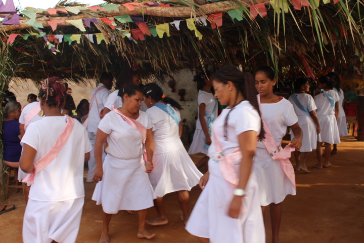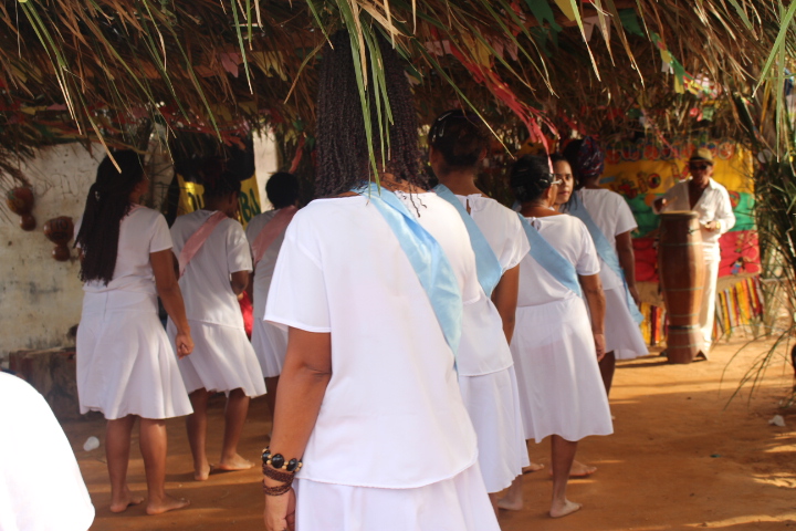 No último sábado, 21, mulheres da comunidade se vestiram de branco para a dança das promessas à São Gonçalo, o padroeiro da festividade. Descalças, elas realizam durante todo o dia um ritual que serve como pagamento de promessas feitas ao padroeiro por membros da comunidade. Enquanto dançam, quem fez a promessa fica no centro da barraca de palha, improvisada, onde tudo acontece.