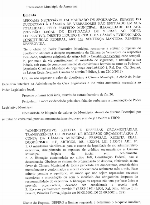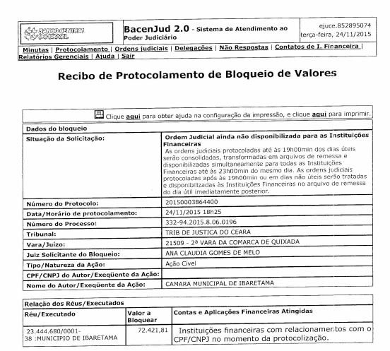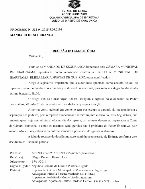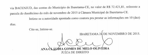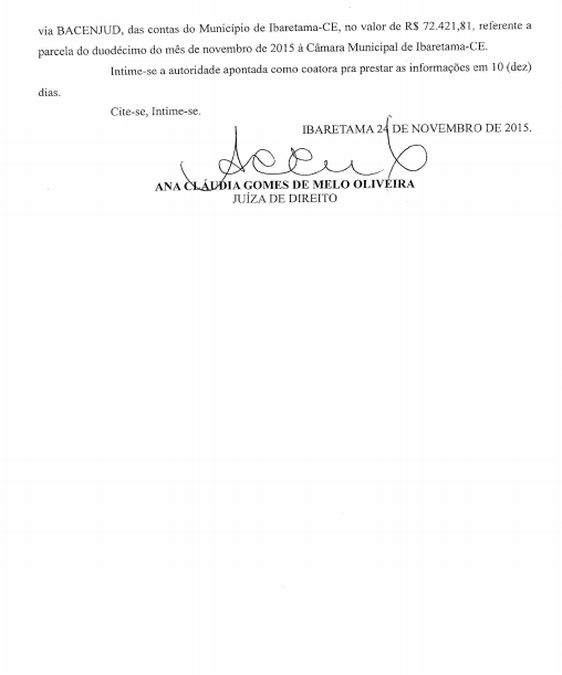 Como resultado, a Juíza de Direito que atende a Comarca Vinculada de Ibaretama, Dra. Ana Cláudia Gomes de Melo, decretou no último dia 24 deste mês o bloqueio de R$ 72.421,81 das contas da prefeitura, de modo a assegurar, via força judicial, o repasse à Câmara Municipal daquele município.