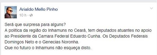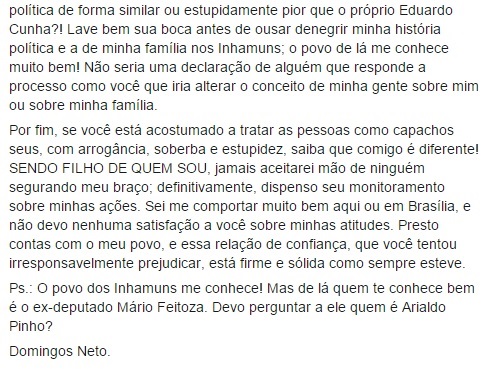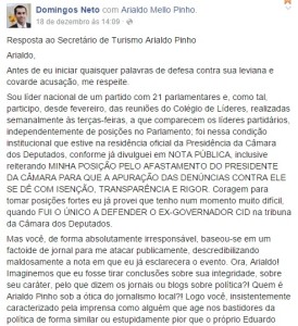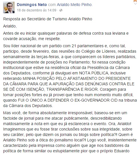 Ainda de acordo com o site, Familiares e aliados de Domingos Neto manifestaram indignação com as declarações de Arialdo Pinho que o acusou de defender o presidente da Câmara dos Deputados, Eduardo Cunha (PMDB), denunciado pelo suposto recebimento de propina no escândalo da Petrobras. Domingos rebateu Arialdo, o acusou de arrogante e disse que não aceita ser capacho.