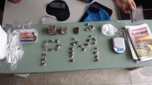 Eles realizaram uma vistoria na residência, mas, não foi encontrado nada, porém, no quintal da residência vizinha foi encontrado uma quantidade de material ilícito como 01 mini balança de precisão, 03 cadernos contendo anotações sobre valores, nomes e telefones de pessoas, 03 pedaços de maconha bruta, pesando 82,4 gramas, mais 33,1 gramas de maconha acomodada em 34 pequenos sacos plásticos, já no ponto de entrega, 9,5 gramas de cocaína, vários sacos plásticos, também R$ 16,00 reais em espécie e R$ 5,10 reais em moeda, todo esse material estava em um deposito branco.
