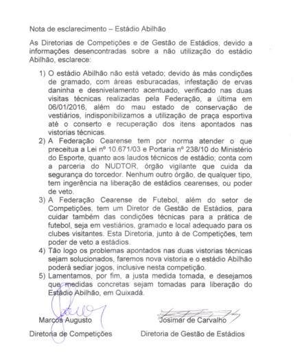 A Federação Cearense de Futebol emitiu uma nota de esclarecimento sobre a situação do estádio Abilhão, em Quixadá.