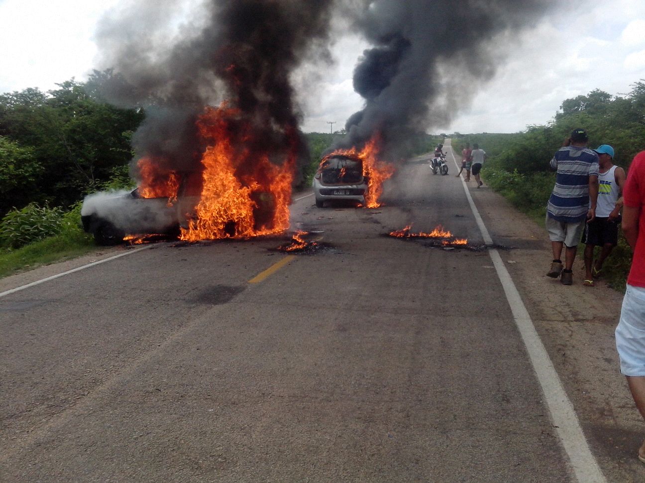 Veículos foram incendiados por bandidos durante fuga após assalto a agência do Banco do Brasil em Novo Oriente.