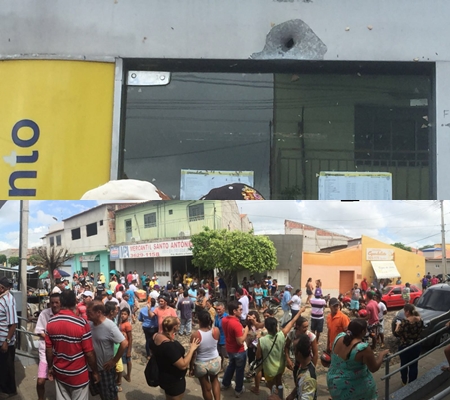 Foto mostra a força das armas usadas pelo bando. Um dos disparos na entrada da agência deixou esse buraco. Após o assalto, populares se aglomeraram no local da ação.