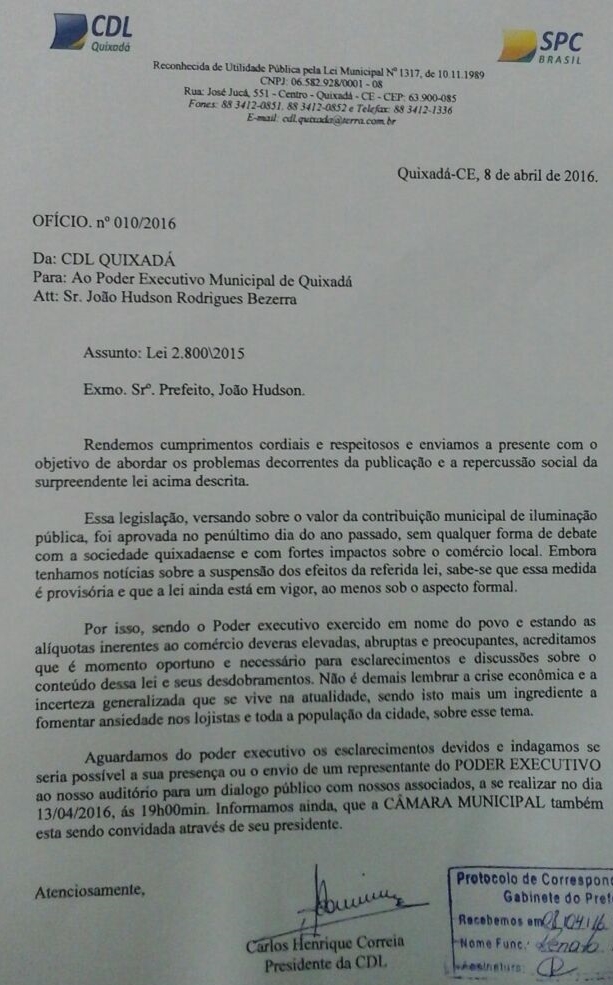O presidente da Câmara dos Dirigentes Lojistas de Quixadá (CDL), Carlos Henrique Correia, enviou à Prefeitura e à Câmara de Vereadores deste município do Sertão Central, uma solicitação de esclarecimentos acerca da Lei 040/2015, que elevou a taxa de iluminação pública para patamares considerados inaceitáveis pelos consumidores.