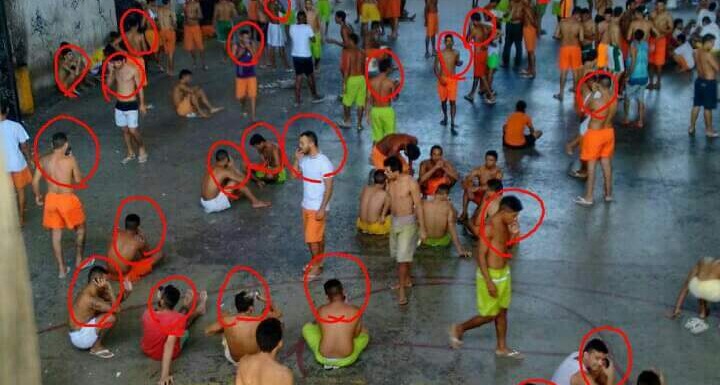 Nas imagens, dezenas de presos apareceram vestidos com as fardas tradicionais distribuídas aos internos do Sistema Penitenciário do Ceará. São camisetas brancas e calções nas cores verde limão e laranja.