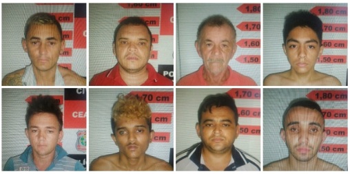 Os presos foram identificados como: Fábio Jandson Gomes de Souza (35), conhecido como “Jadson do Feijão”, natural de Quixadá; Lourival Barreto Braga (65), conhecido como “Louro Braga”; e seu filho, Lourival Barreto Graga Junior (27), conhecido como “Alemão”, ambos naturais de Mombaça; Douglas Aparecido Piovesan (23), conhecido como “Paulista”, natural do Estado de São Paulo; Antonio Alexandre Gonçalves (20), natural de Iguatu; Reginaldo Lima do Nascimento (19), conhecido como “Bileu”, natural de Morada Nova; José Aremilton Gonçalves Almeida (34), conhecido como “Tetê”, natural de Pedra Branca; e Antônio Adriano Araújo Rufino (30), conhecido como “Corete”, também natural de Pedra Branca. Um nono suspeito identificado como José Marcelo Rodrigues de Oliveira (24), conhecido como “Bigodinho”, natural de Pedra Branca, foi morto em confronto com a Polícia na cidade de Senador Pompeu, logo após o bando ter realizado a ação criminosa contra as agências e que foi interrompida pela Polícia.