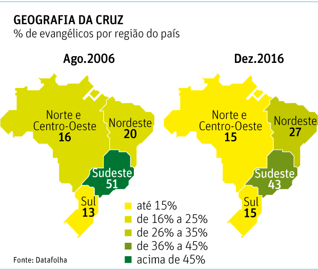 Feita em 174 municípios, a pesquisa tem margem de erro de 2 pontos percentuais para mais ou para menos (nível de confiança de 95%). Procurada, a CNBB (conferência dos bispos) não quis comentar.