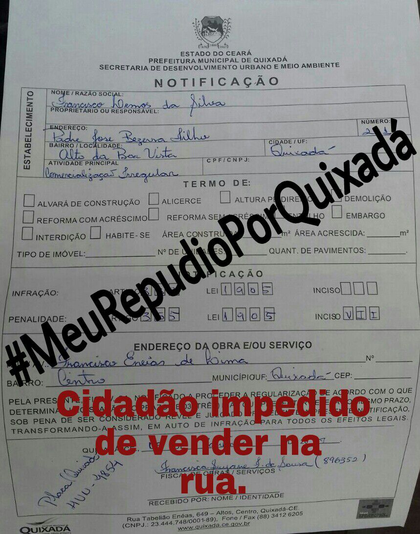 Alguns membros da prefeitura de Quixadá já anunciaram a intenção do Prefeito Ilário Marques (PT) de tirar, a qualquer custo, as pessoas que trabalham como ambulantes e camelôs dos calçadões e das calçadas do centro da cidade.