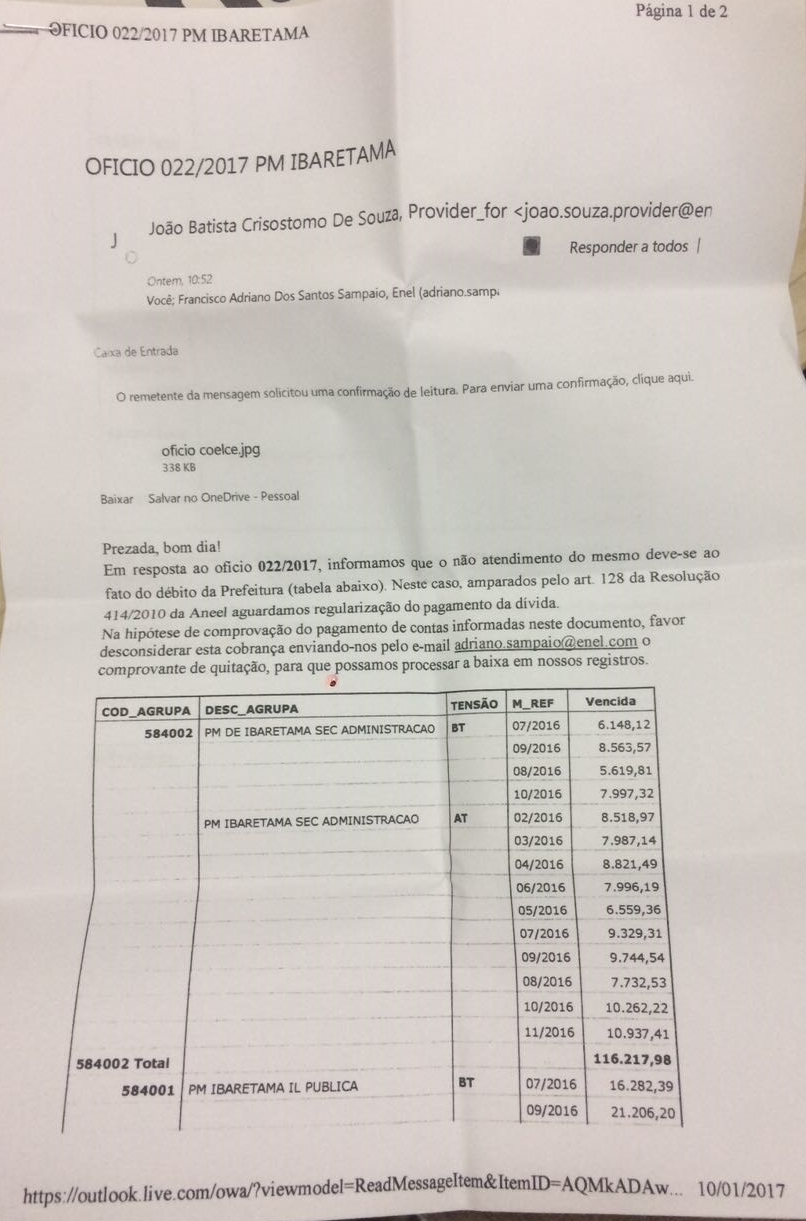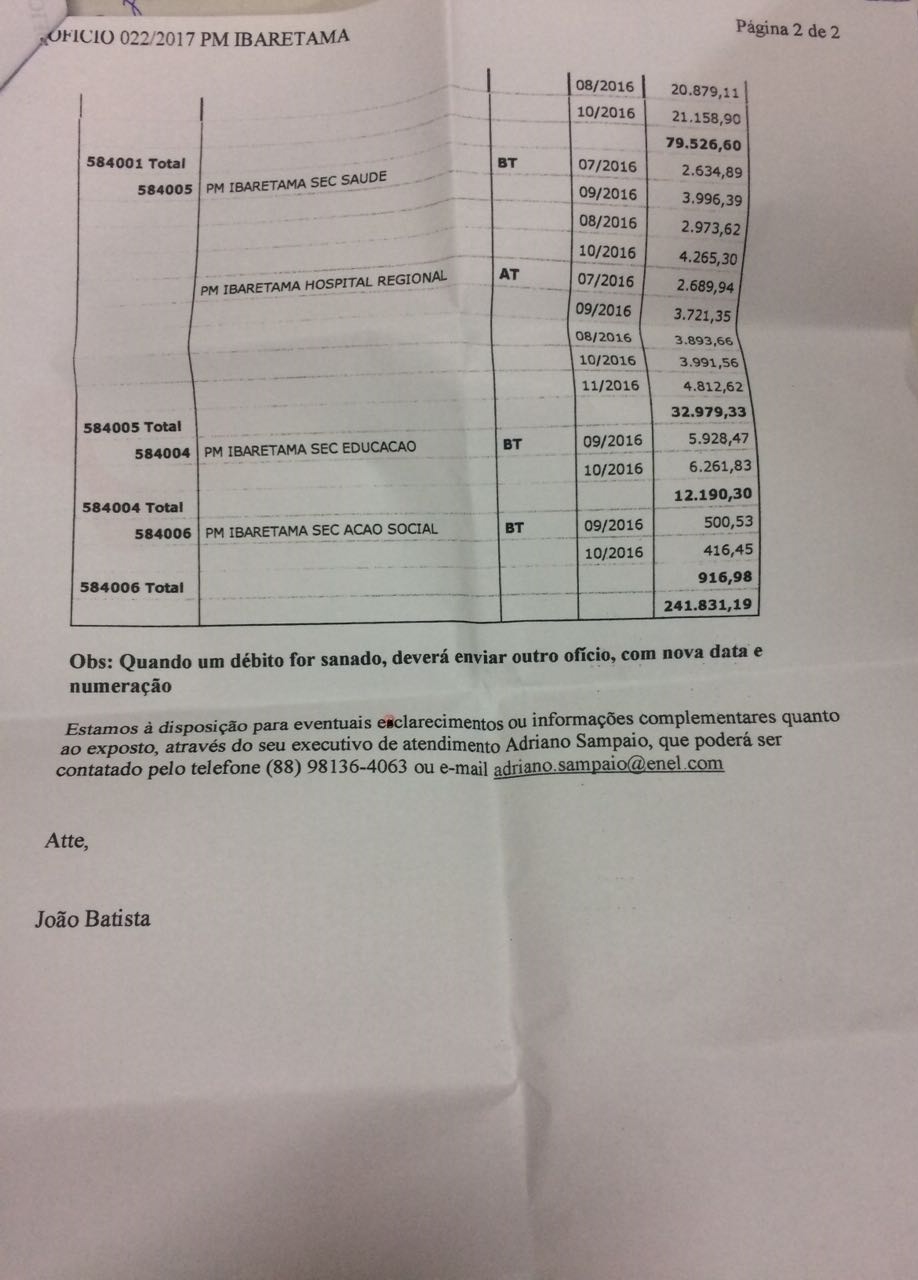 Veja abaixo os documentos que comprovam o débito da Prefeitura de Ibaretama junto a Enel.