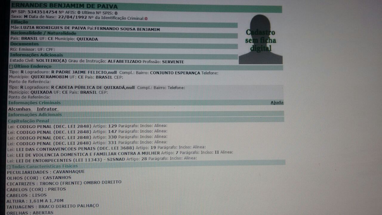 Apesar da pouca idade, Ernandes já possui uma extensa ficha criminal, responde a pelo menos 7 crimes, entre eles: Art. 129, Art.147, Art.330, Art. 331 do Código Penal Brasileiro. Ele estava preso em Quixeramobim e havia saído da cadeia recentemente, mais precisamente no mês de novembro.
